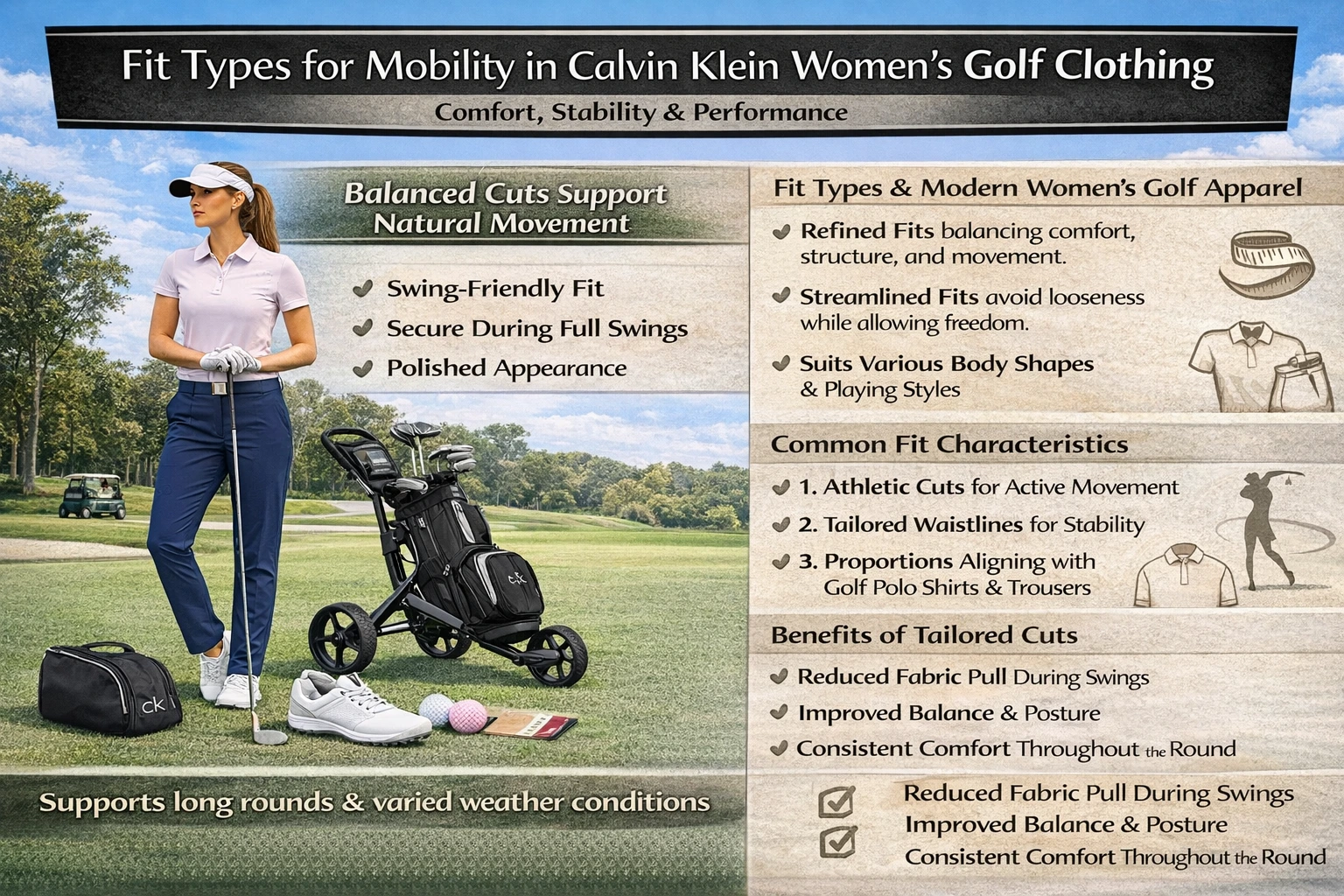 Modern women’s golf apparel uses refined fit types that balance comfort, structure, and movement. Calvin Klein golf clothing typically adopts streamlined fits that avoid excess looseness while preventing restriction, aligning with current golf brands standards. These fits suit various body shapes and playing styles across ladies golf clothing ranges.