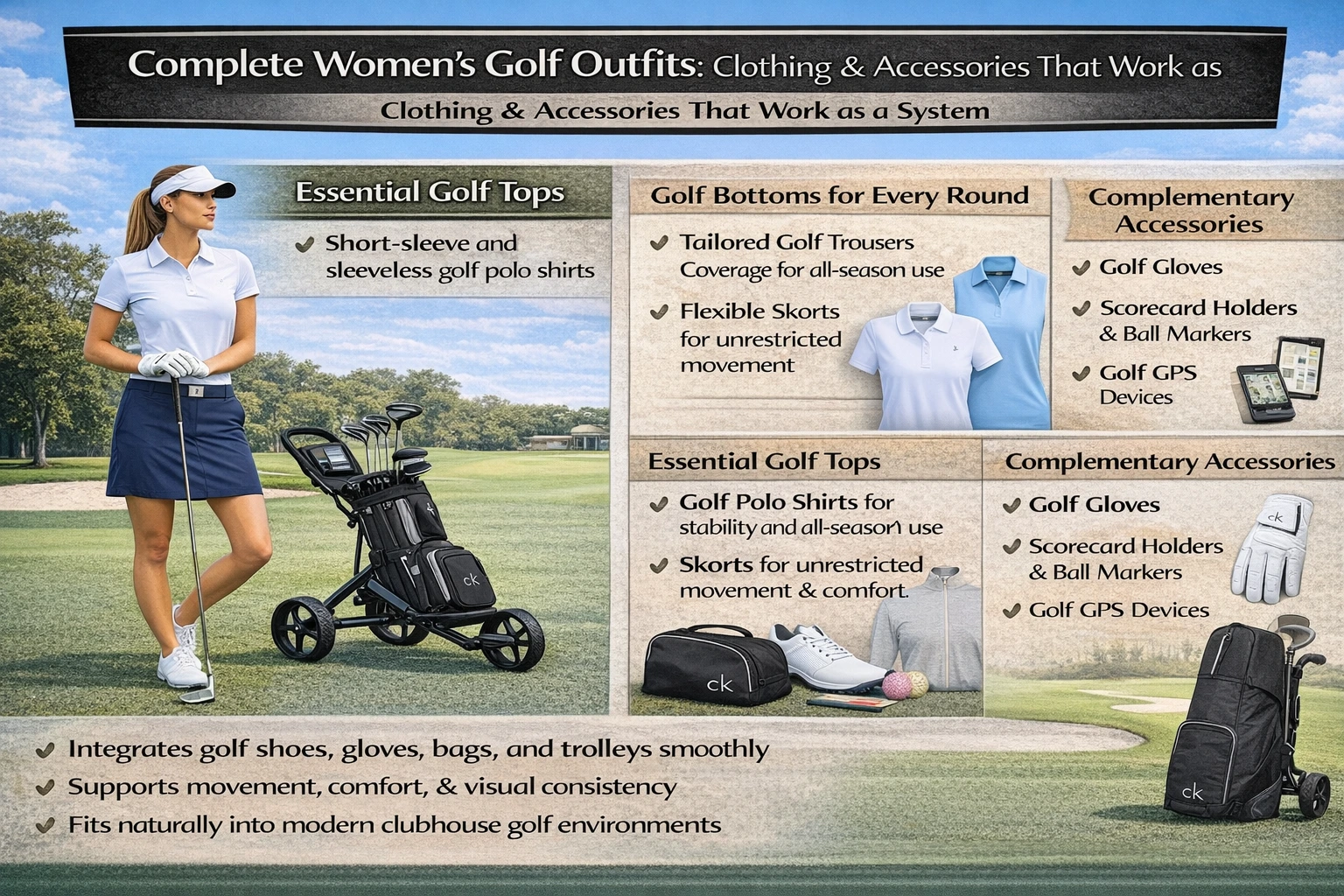 A complete women’s golf outfit includes a golf polo shirt, skort or golf trousers, weather layer, golf shoes, and coordinated golf accessories.