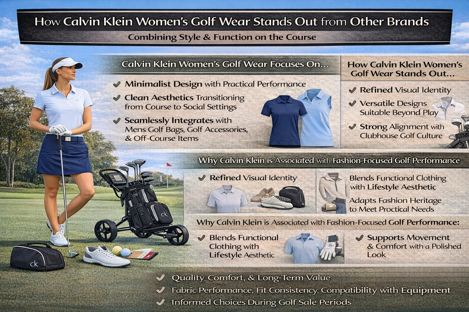 Calvin Klein ladies golf wear differs through its emphasis on minimalist design combined with practical performance. Compared with sport-driven brands, Calvin Klein places stronger focus on clean aesthetics that transition smoothly from the golf course to social settings. The clothing integrates naturally with mens golf bags, golf accessories, and off-course items without appearing overly technical.