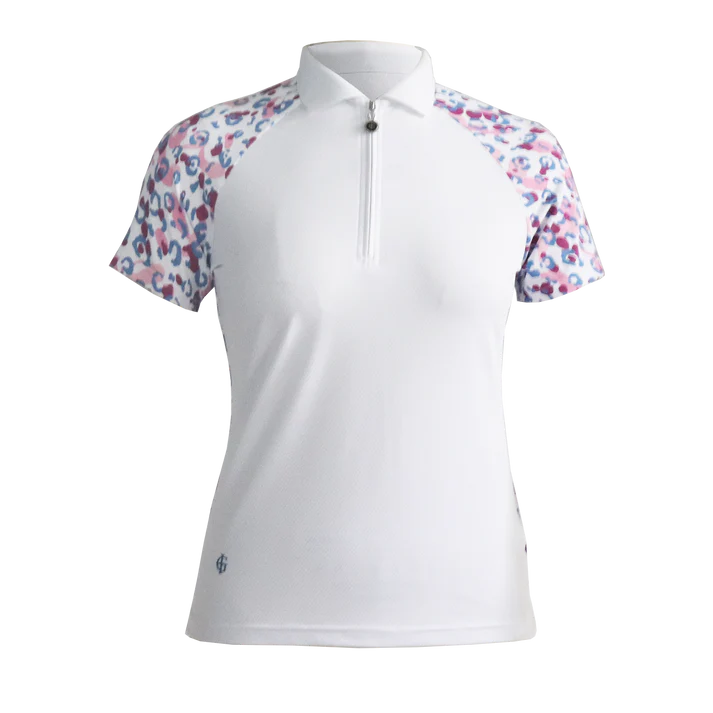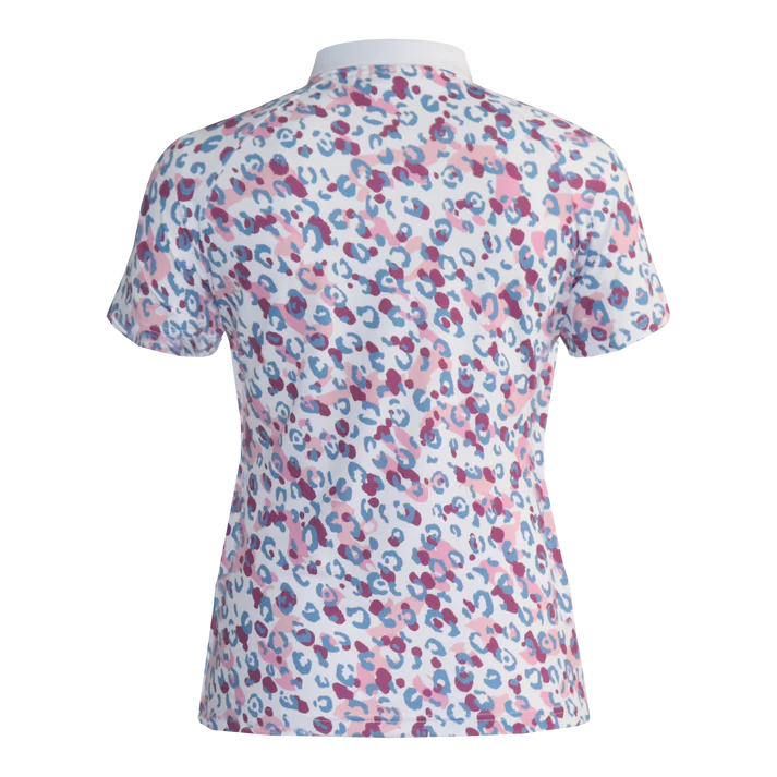 Make a statement on the course with this Ladies’ Ribbed Collar Polo featuring a bold leopard print on the sleeves and back. Crafted from honeycomb jacquard stretch fabric, it offers breathable comfort, UV protection, and moisture-wicking finishes. The ribbed collar and sleek jetted zip detail add a modern and stylish touch to this standout piece.